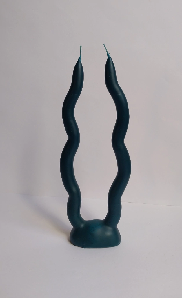 Vela realizada en cera de abeja. Realizada por inmersión reiterada y modelada a mano. Posee 2 mechas tal cual se ve en la foto.